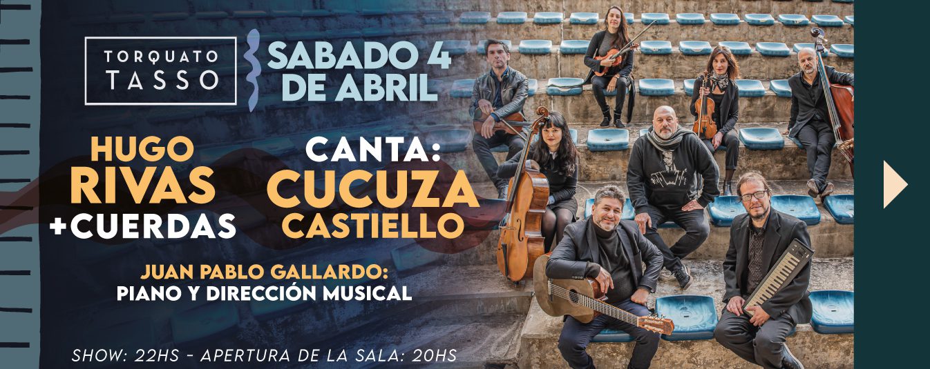 El sábado 4 de abril, el escenario de Torquato Tasso recibe a Hugo Rivas + Cuerdas, en una noche imperdible con la voz inconfundible de Cucuza Castiello.